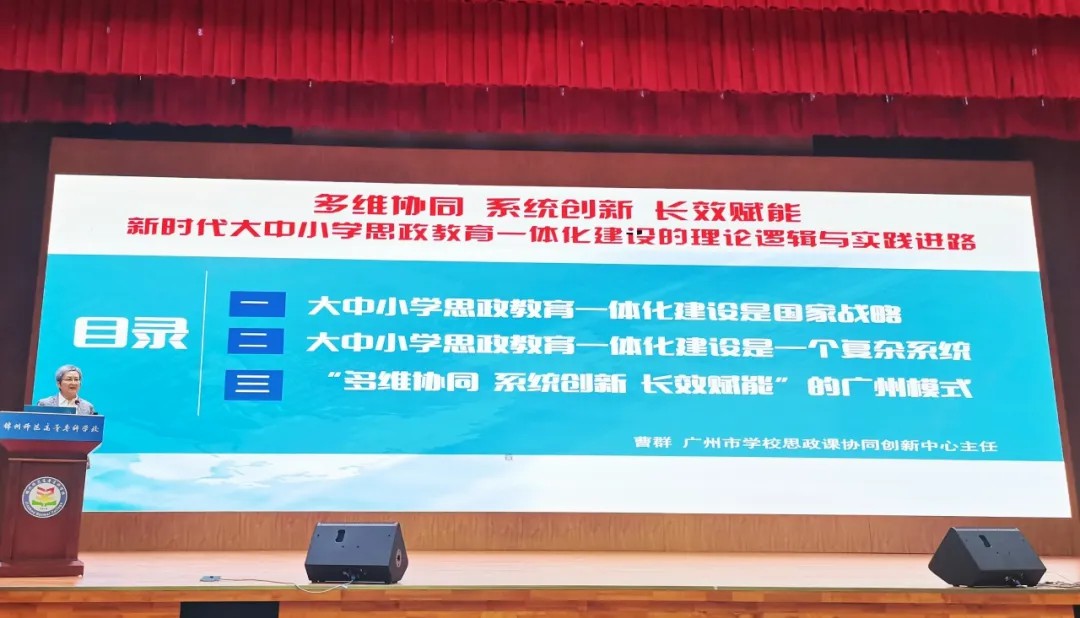 广州职业技术大学马克思主义学院直属党支部书记、院长,广东省大中小学思政一体化建设教职委专家,教育部全国高校思政课名师工作室负责人曹群教授在活动中分享了跨区域的大中小学思政一体化建设的专业经验,为各单位思政教育提供新思路。