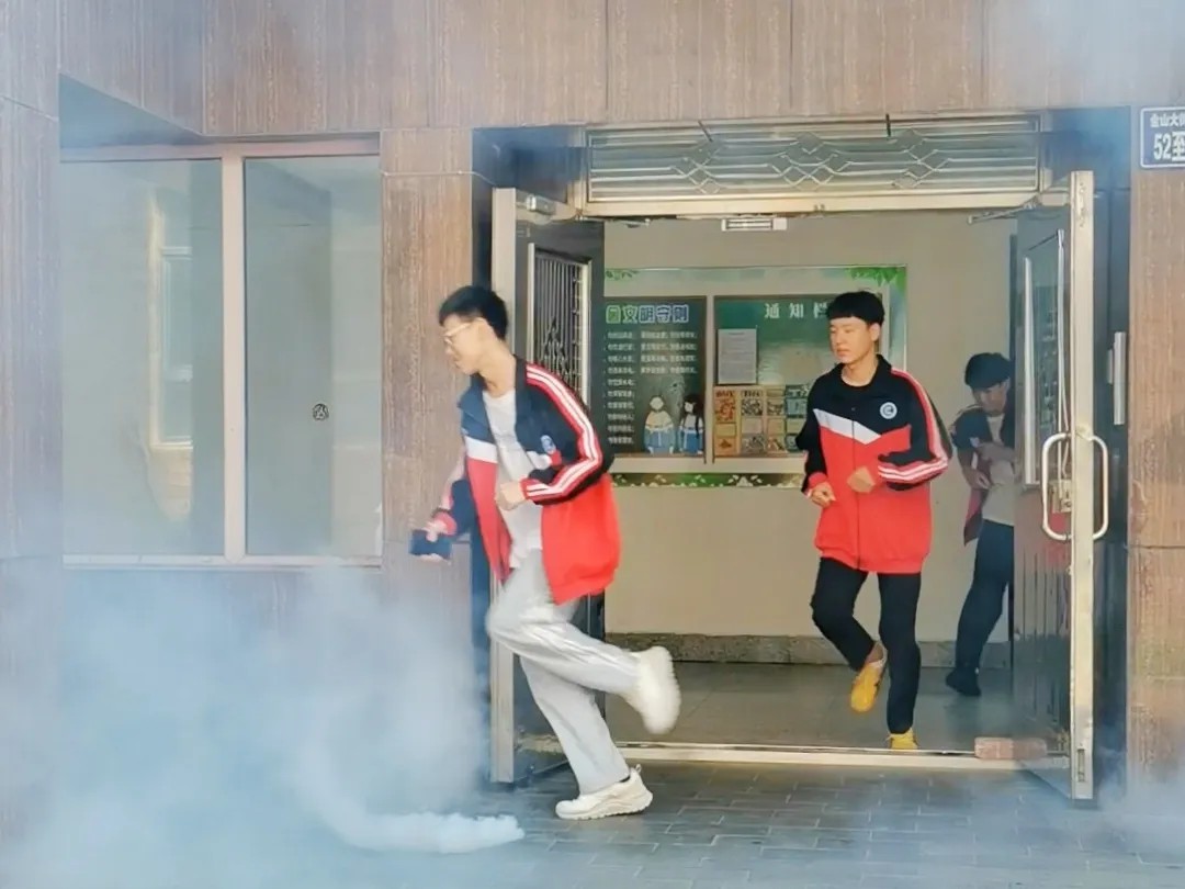 本次演练同时在教学楼和学生宿舍开展,徐艳君书记现场指挥。哨声响起,模拟烟雾迅速在教学楼和宿舍楼的走廊弥漫,营造出真实的火灾场景。听到警报后,各班学生在班主任的引导下,手捂口鼻,弯腰低姿,按照预设疏散路线快速向指定集合点撤离。各班班主任第一时间清点人数并向指挥组汇报。